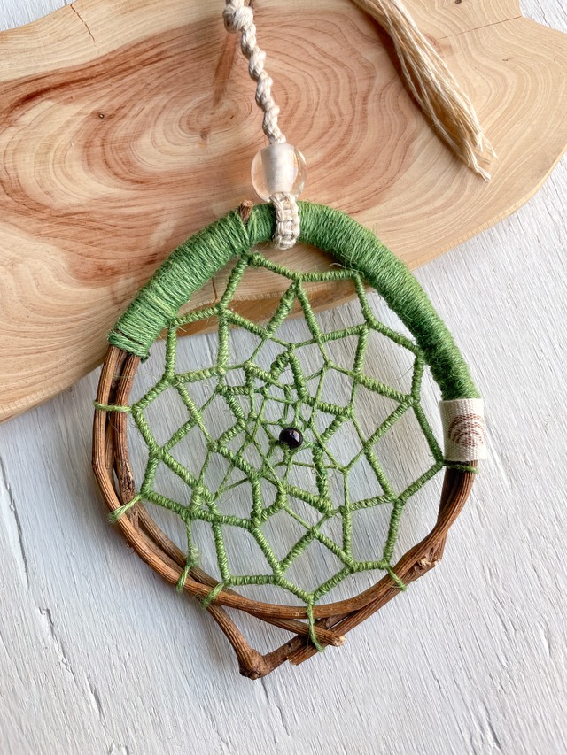 ---------------------- Dreamcatcher 「#1.1」 縦:13cm 横:10.5cm 紐:18cm 素材 : ヘンプ(麻)・あけびの蔓・ウッドビーズ・ガラス ---------------------- 【発送について】 ・1〜3日前後で発送。(土日祝除く)