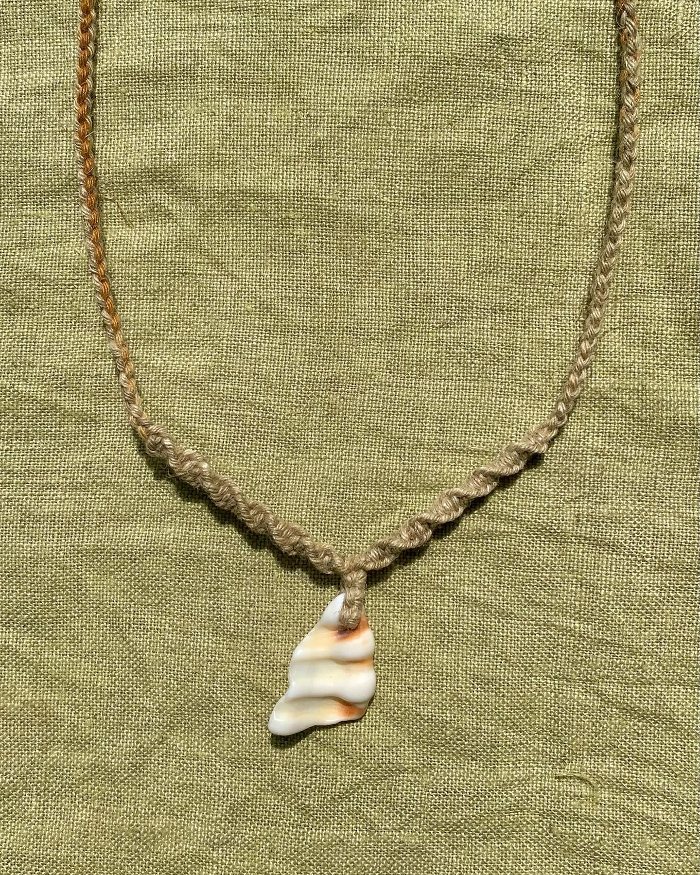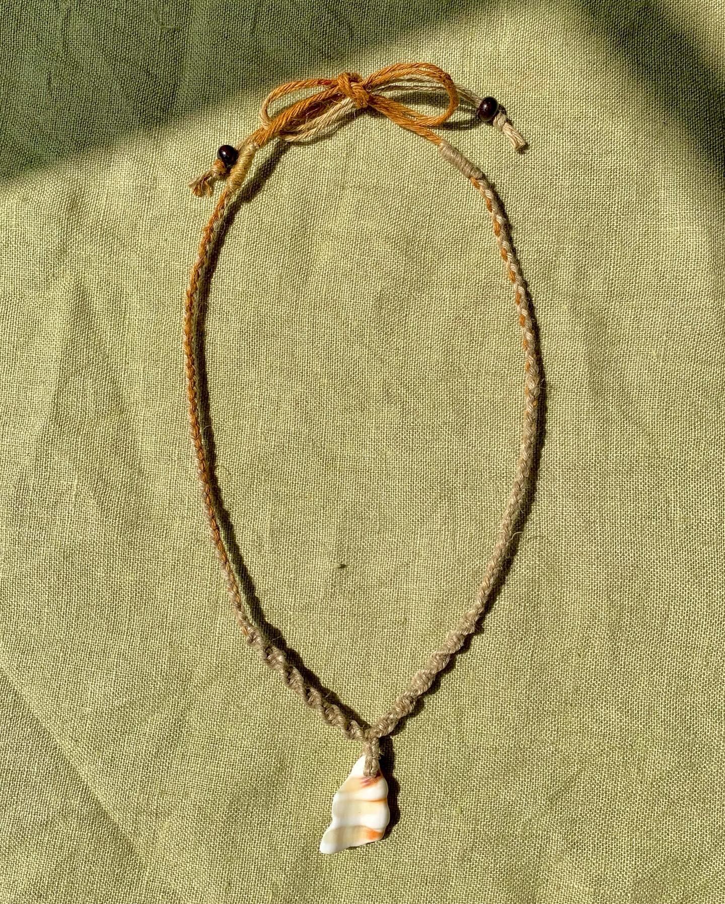 プリプリな触り心地が気持ちいい貝殻にオレンジでムラ染めしたヘンプを編み込んだネックレス。