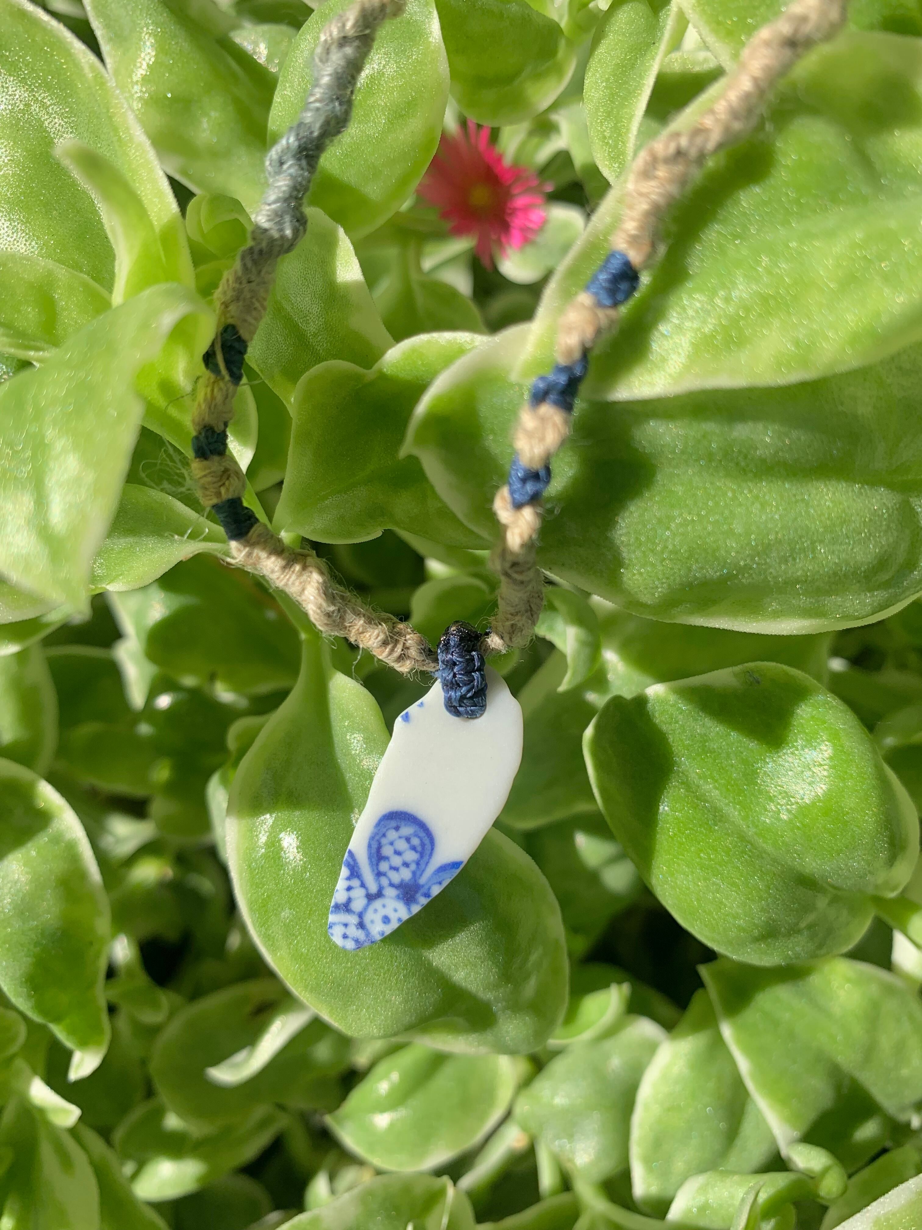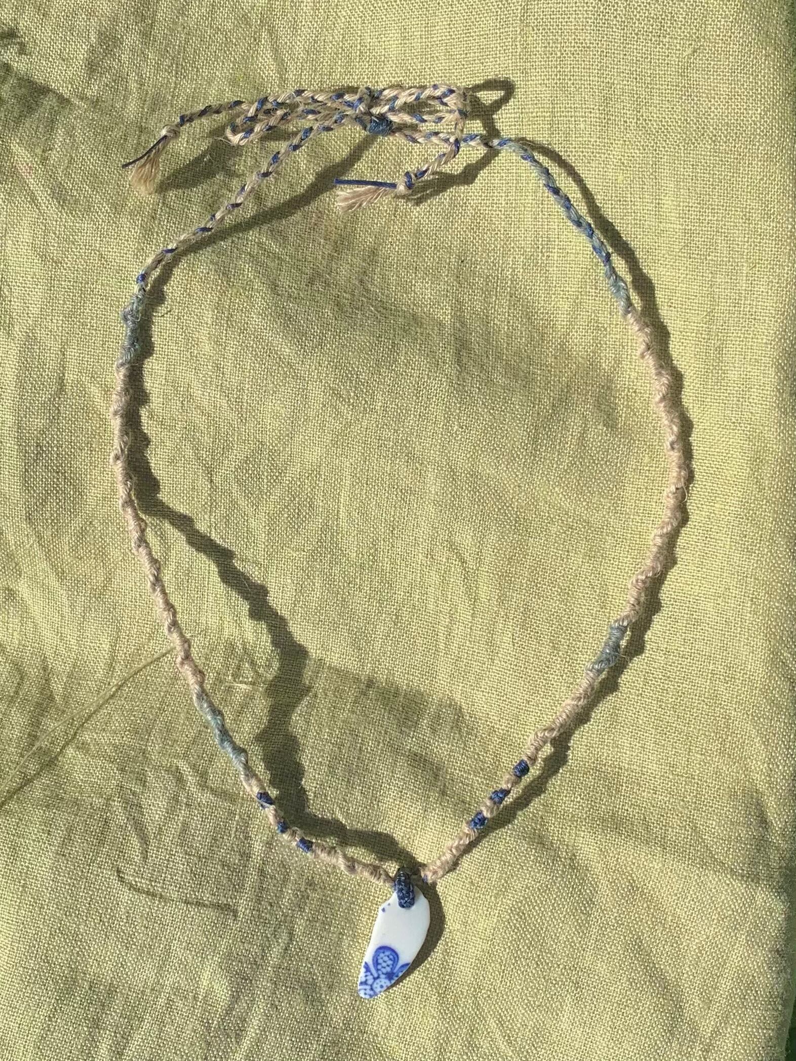 花柄のシー陶器にブルーでムラ染をしたヘンプを編み込んだネックレス。