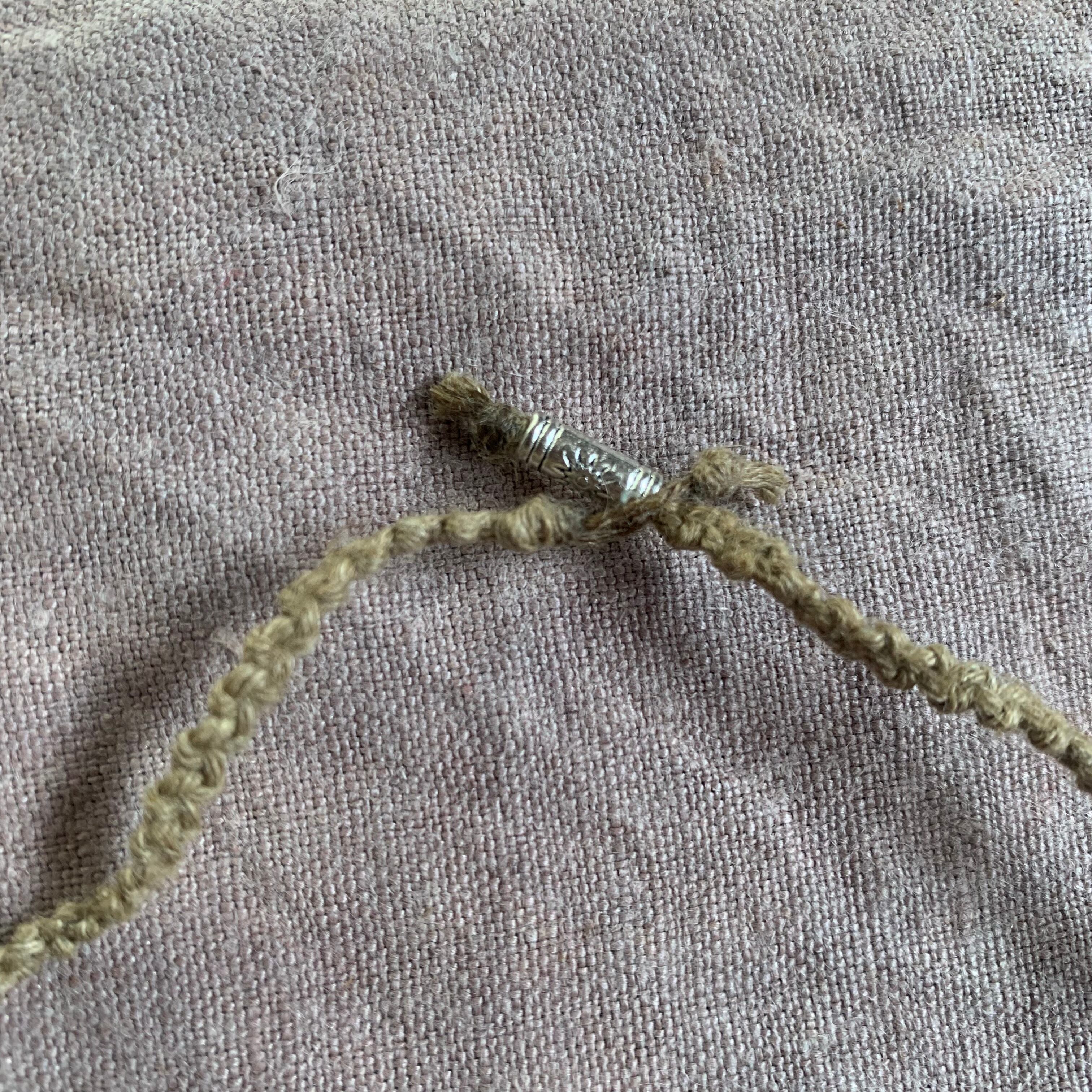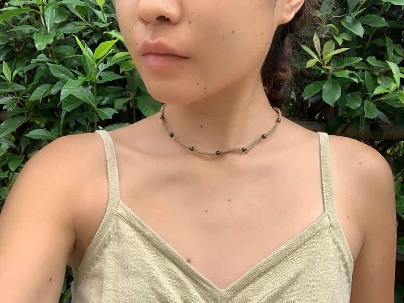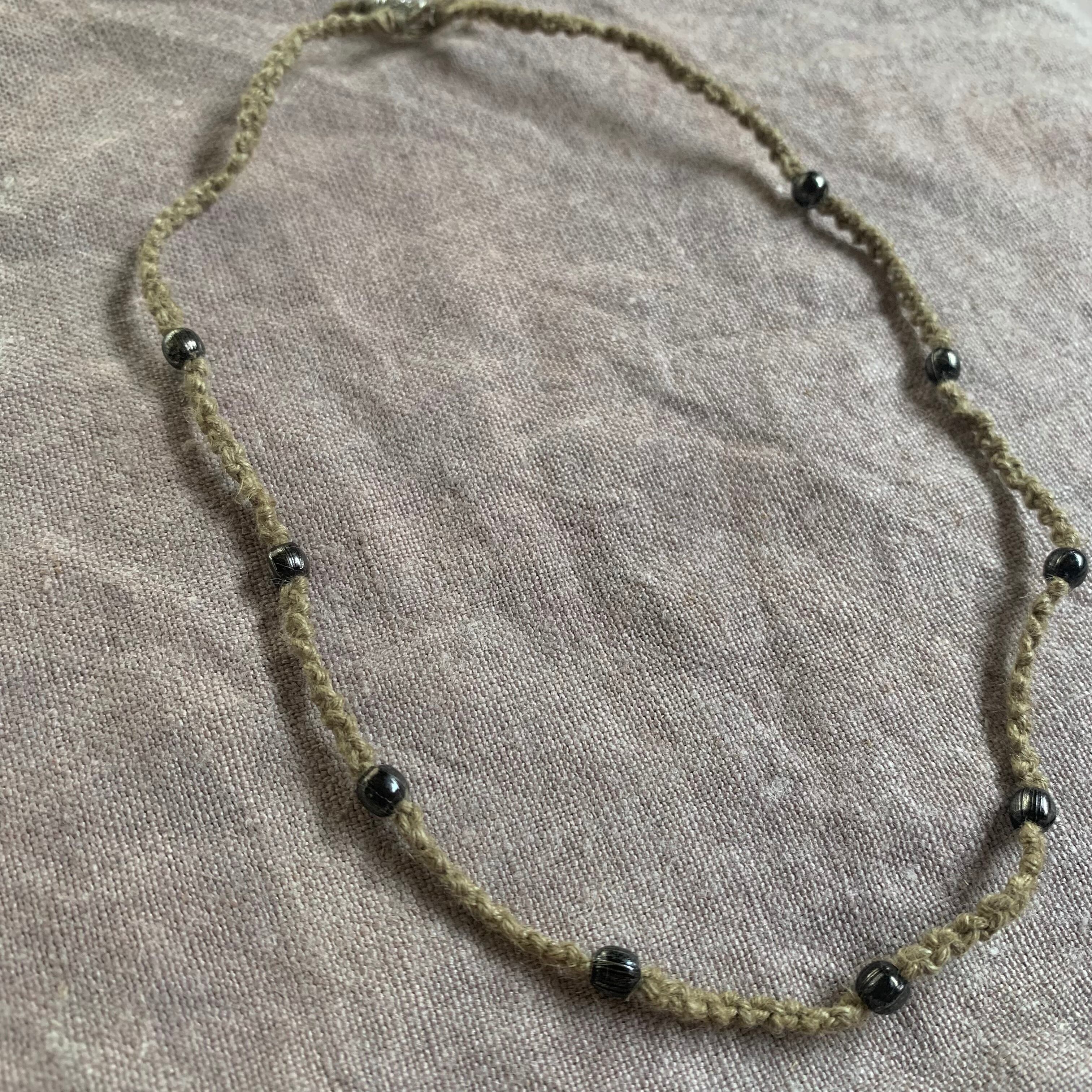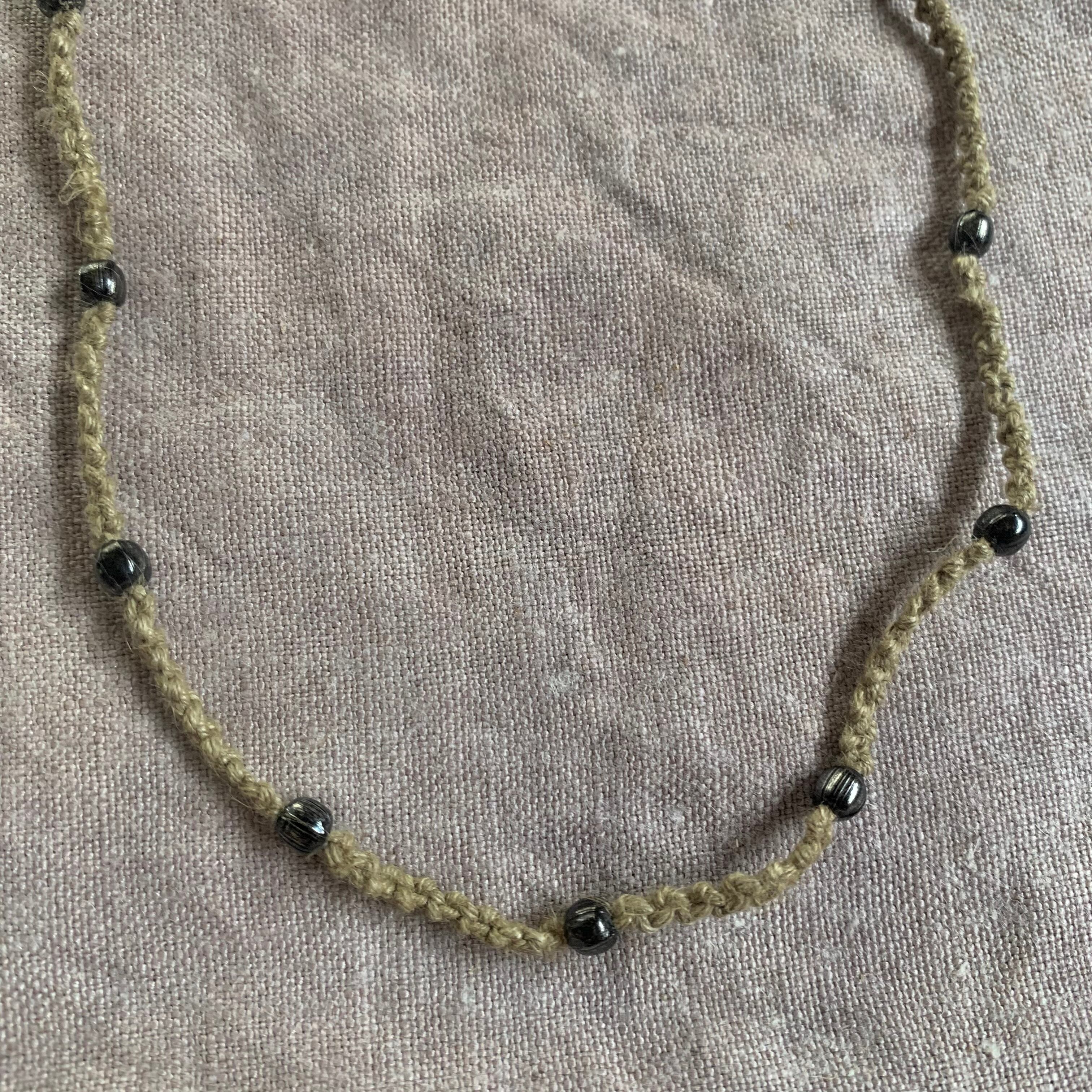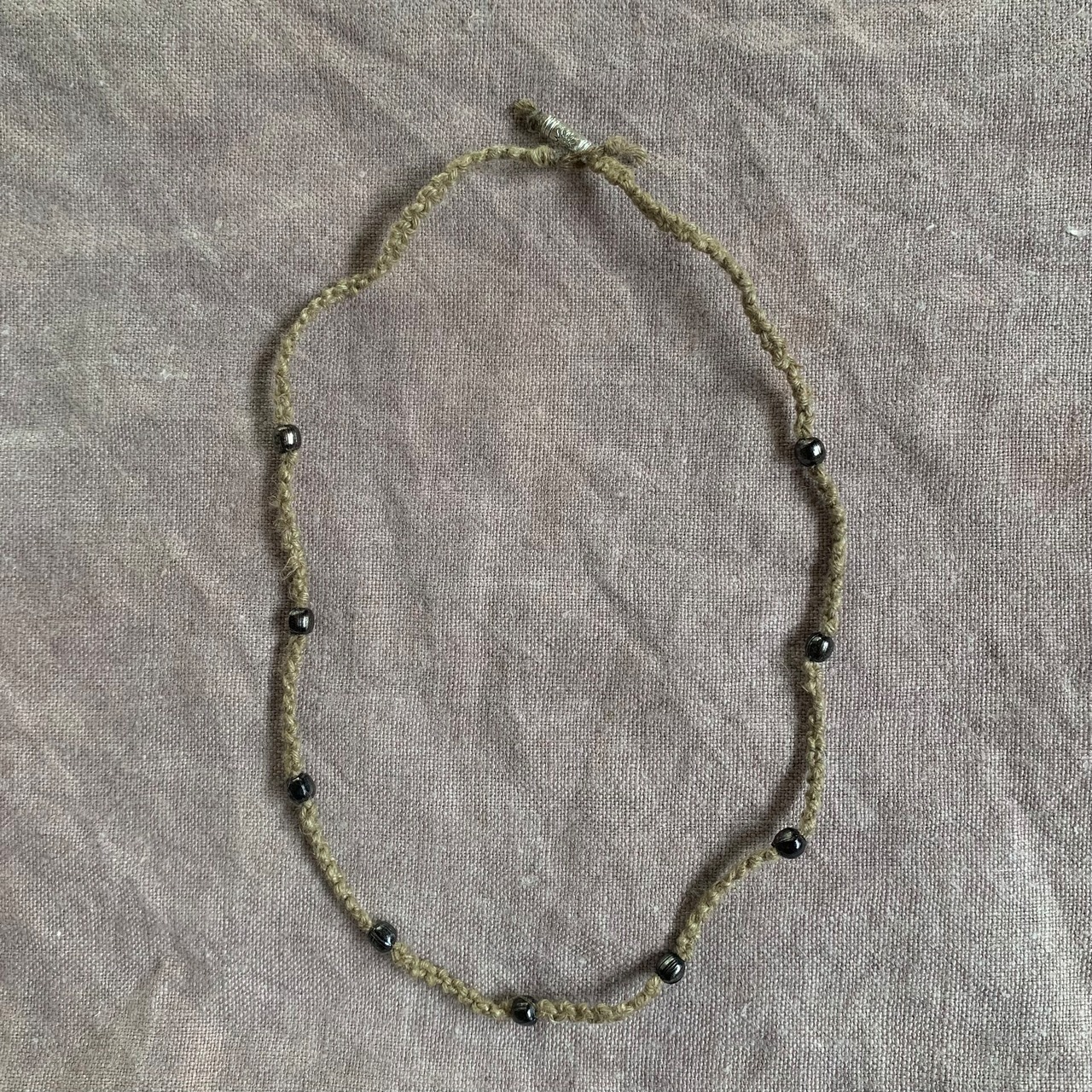 細く編んだカーキの麻紐にブラックシルバービーズが映えるネックレス。