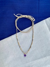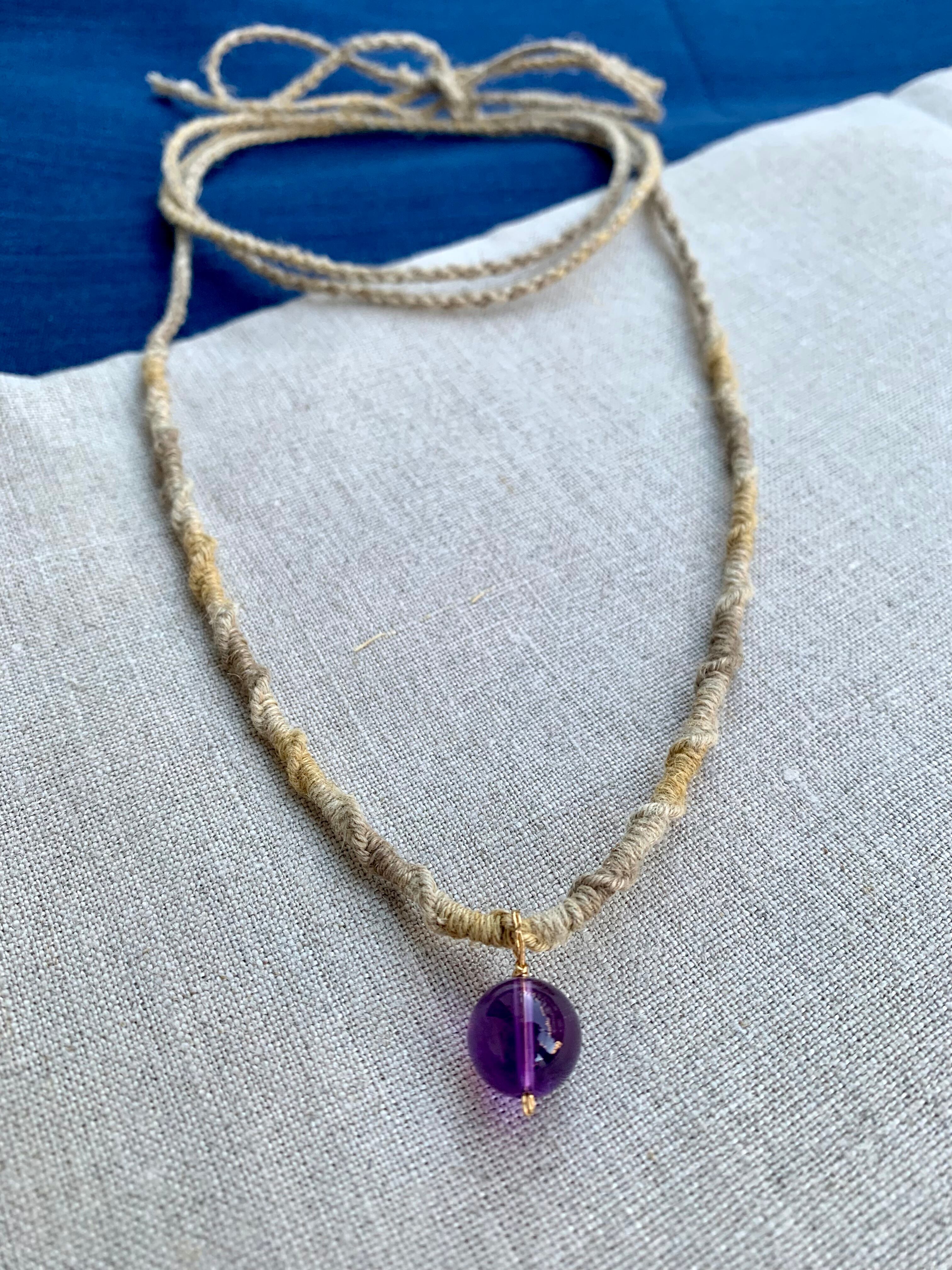 イエローとグレーでムラ染めした麻紐にアメジストを。